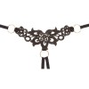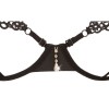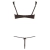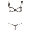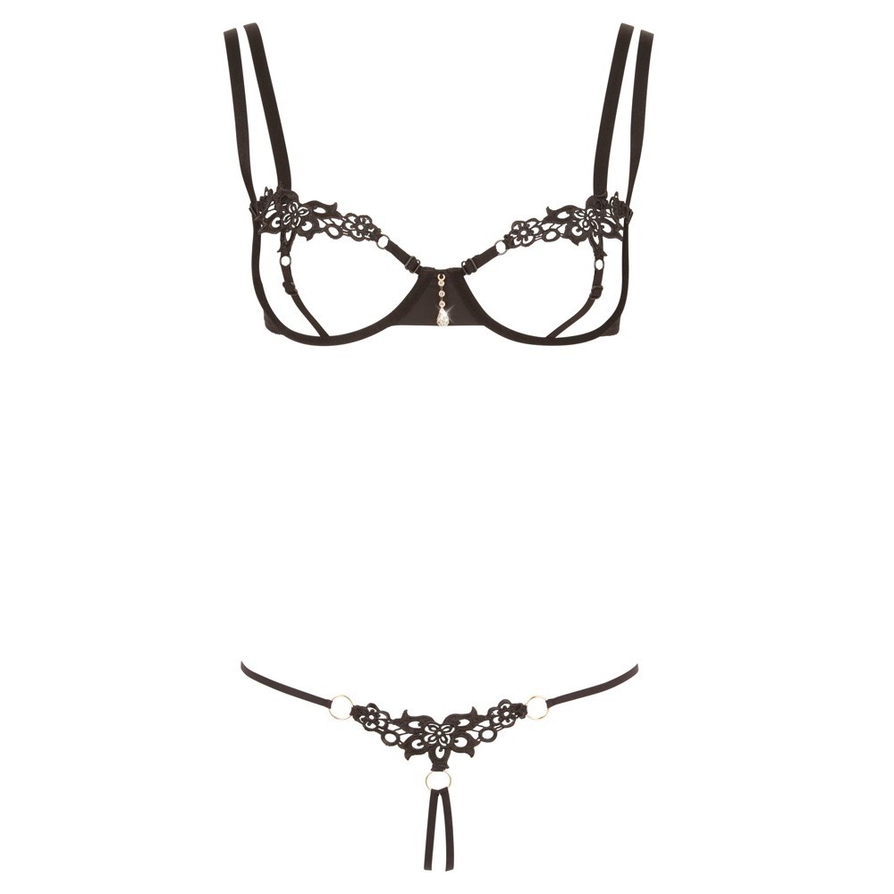 Der BH mit offenen Cups besteht nur aus Bügeln und Trägern und bietet einen unwiderstehlichen Anblick, wobei die Brustwarzen nur durch zarte Stickereien bedeckt sind. Er hat einen Hakenverschluss am Rücken und verstellbare Träger für eine perfekte Passform. Der passende String ist im Schrittbereich offen und hat eine elegante Stickerei auf der Vorderseite, die durch drei kleine silberne Ringe mit den Trägern verbunden ist.
