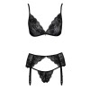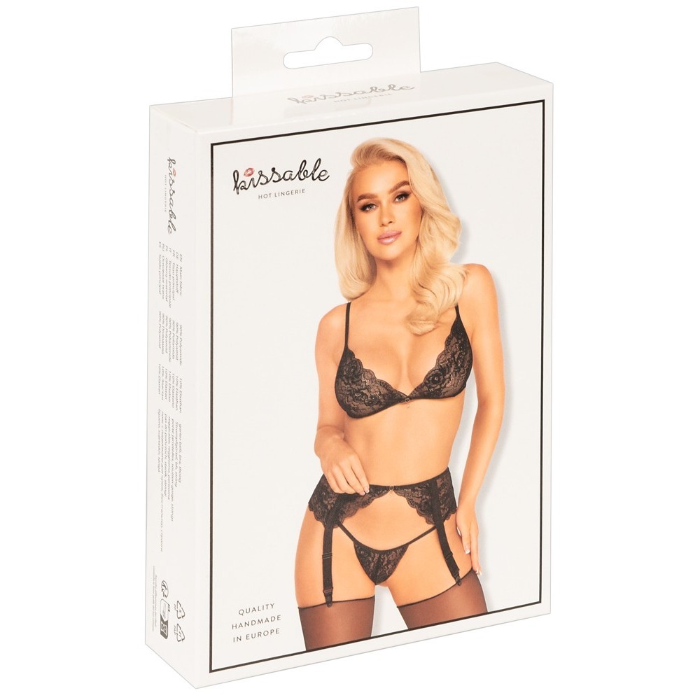 Das Set von Kissable besteht aus einem weichen BH, einem Strumpfgürtel und einem String und ist vollständig aus feiner schwarzer Spitze mit eleganten goldenen Details gefertigt. Weich und elastisch für höchsten Tragekomfort. Der BH und der Strumpfgürtel sind auf der Vorderseite mit Schleifen und funkelnden Strasssteinen verziert und verfügen beide über einen Hakenverschluss am Rücken. Die Träger und Strumpfhalterbänder sind verstellbar und sorgen so für eine perfekte Passform. Der verführerisch gestaltete String aus Spitze besticht durch zwei feine, elastische Bänder, die sich vorne treffen.