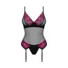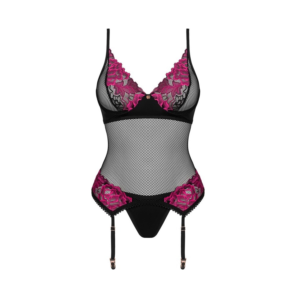 Das Rosenty-Set von Obsessive umfasst ein Korsett mit Strumpfhaltern und einen Tanga. Das Top aus weichem, schwarzem Stretchstoff mit zarter rosa Spitze am Ausschnitt und an den Hüften hat Bügel-Cups mit einem kleinen Zierelement dazwischen und einen verstellbaren Hakenverschluss am unteren Rücken. Die Träger und Strumpfhalter sind verstellbar, und der blickdichte String passt elegant zum Bustier.