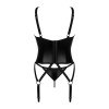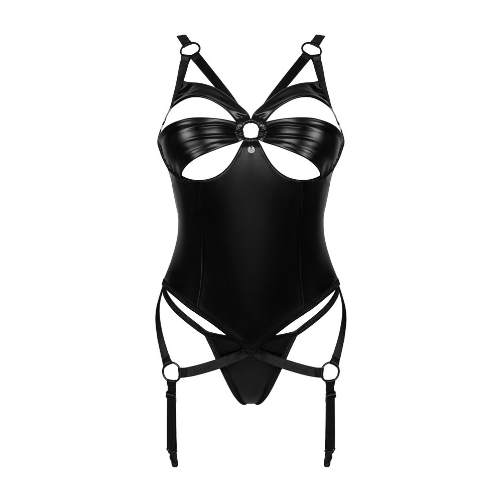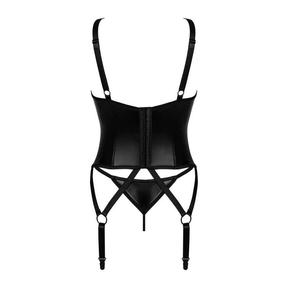 Das Armares-Set von Obsessive umfasst ein Korsett mit Strumpfhaltern und einen perfekt sitzenden Tanga in einem modernen, elastischen und weichen Nass-Look. Die Bügel-Cups haben verführerische Ausschnitte und kleine Schmuckelemente. Die Träger und Strumpfhalter mit praktischen Ringen sind vollständig verstellbar, ebenso wie der Hakenverschluss am Rücken.