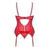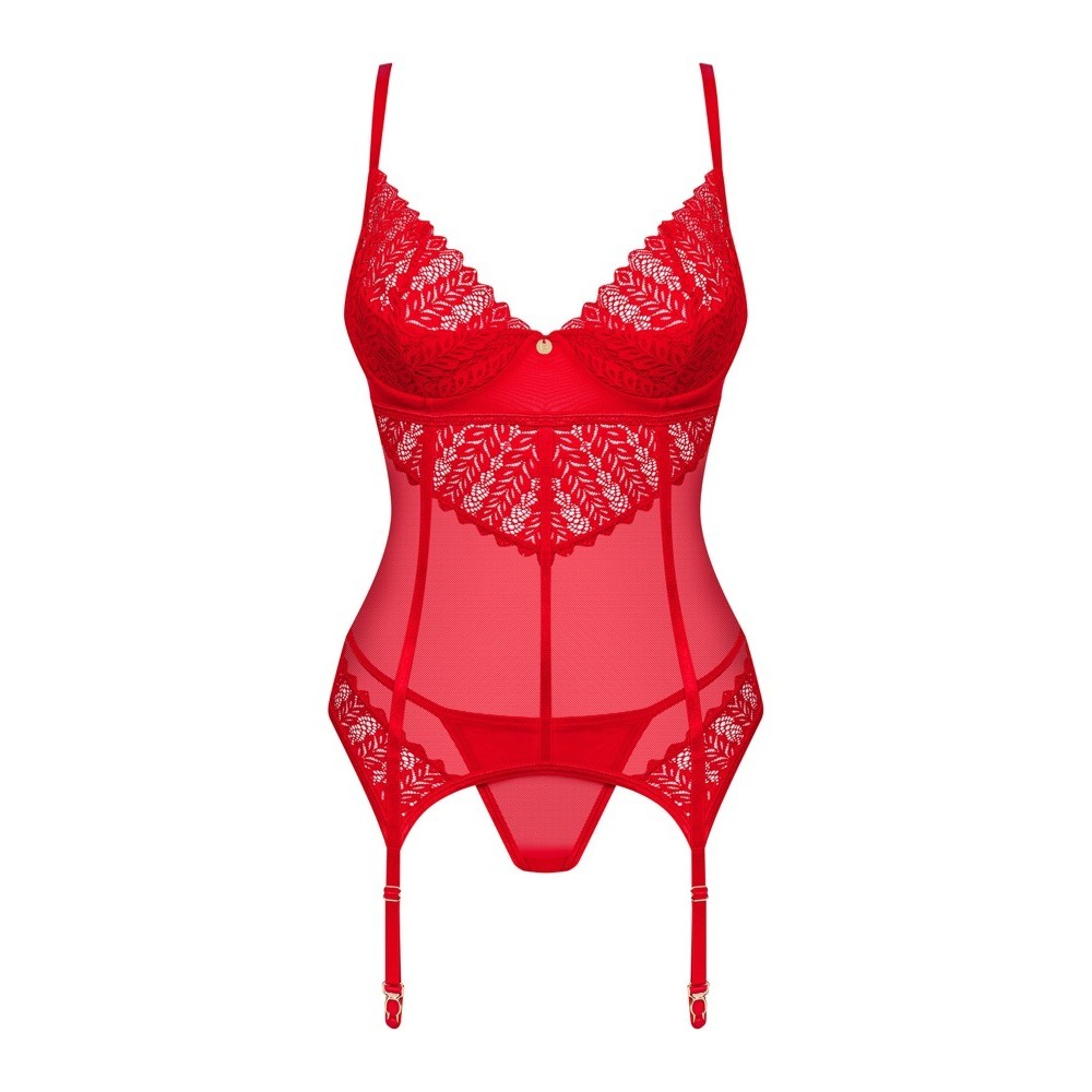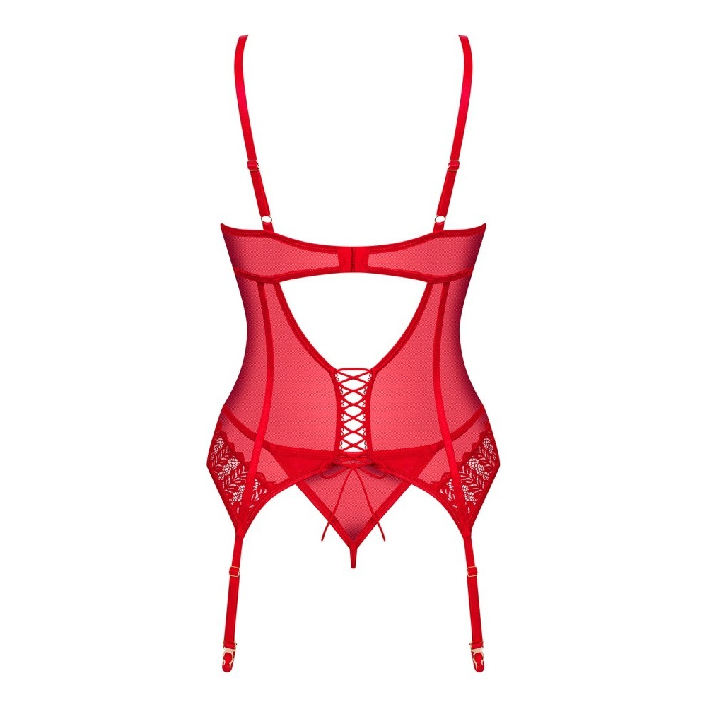 Das Ingridia-Set von Obsessive kombiniert ein Mieder mit Strumpfhaltern aus weichem, elastischem Spitzenstoff mit feinem Tüll und einem zarten String. Die gepolsterten Cups mit Bügeln heben und stützen die Brüste, während die Träger, Strumpfhalter, der Hakenverschluss und die Schleife am Rücken für eine perfekte und bequeme Passform verstellbar sind.