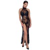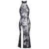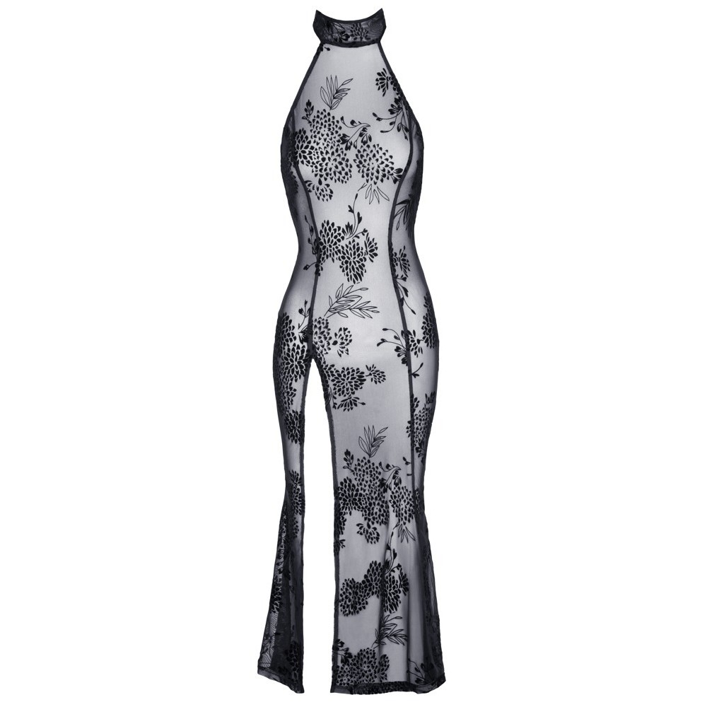 Langes, ärmelloses Kleid von Noir, vollständig aus elastischem Powernet gefertigt und mit einem zarten, florigen Flockdruck überzogen. Das Modell ist figurbetont, mit einem hohen Schlitz vorne am Bein, einem hohen Kragen, der hinten mit einem Knopf geschlossen wird, und einem eleganten ovalen Ausschnitt am Rücken.