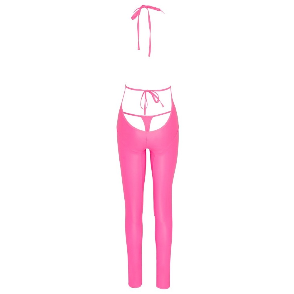Overall mit Kordelzug von Cottelli PARTY, hergestellt aus neonrosa Material mit mattem Glanz, der alle Blicke auf sich zieht. Mit langen, eng anliegenden Beinen und einem tiefen Ausschnitt, der im Bauchnabelbereich endet und in der Mitte geschnürt ist. Der Rücken ist bis zum Gesäßbereich fast vollständig frei, bis auf einen Streifen an der Taille, der hinten gebunden wird. Das weiche, elastische Material sorgt für eine perfekte und bequeme Passform.