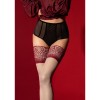 The mix of exotic patterns in crimson on the lace of these stockings is reminiscent of an oriental dance. Your imagination transports you to a setting where extravagant scarves, Persian rugs and beautiful mosaics parade, all against a backdrop of desert illuminated by the golden light of the sand. Let yourself be enveloped by this sensual fantasy.