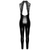 Der eng anliegende, ärmellose Overall von Noir besteht aus einem schönen schwarzen Powerwetlook. Das Oberteil des Overalls ist aus zarter Spitze gefertigt. Es ist weich und elastisch für eine hautnahe, aber bequeme Passform. Es hat einen großen Ausschnitt im Dekolletébereich. Auch auf der Rückseite befindet sich ein großer Ausschnitt. Das Spitzenhalsband mit Neckholder-Ausschnitt hat einen Knopfverschluss.