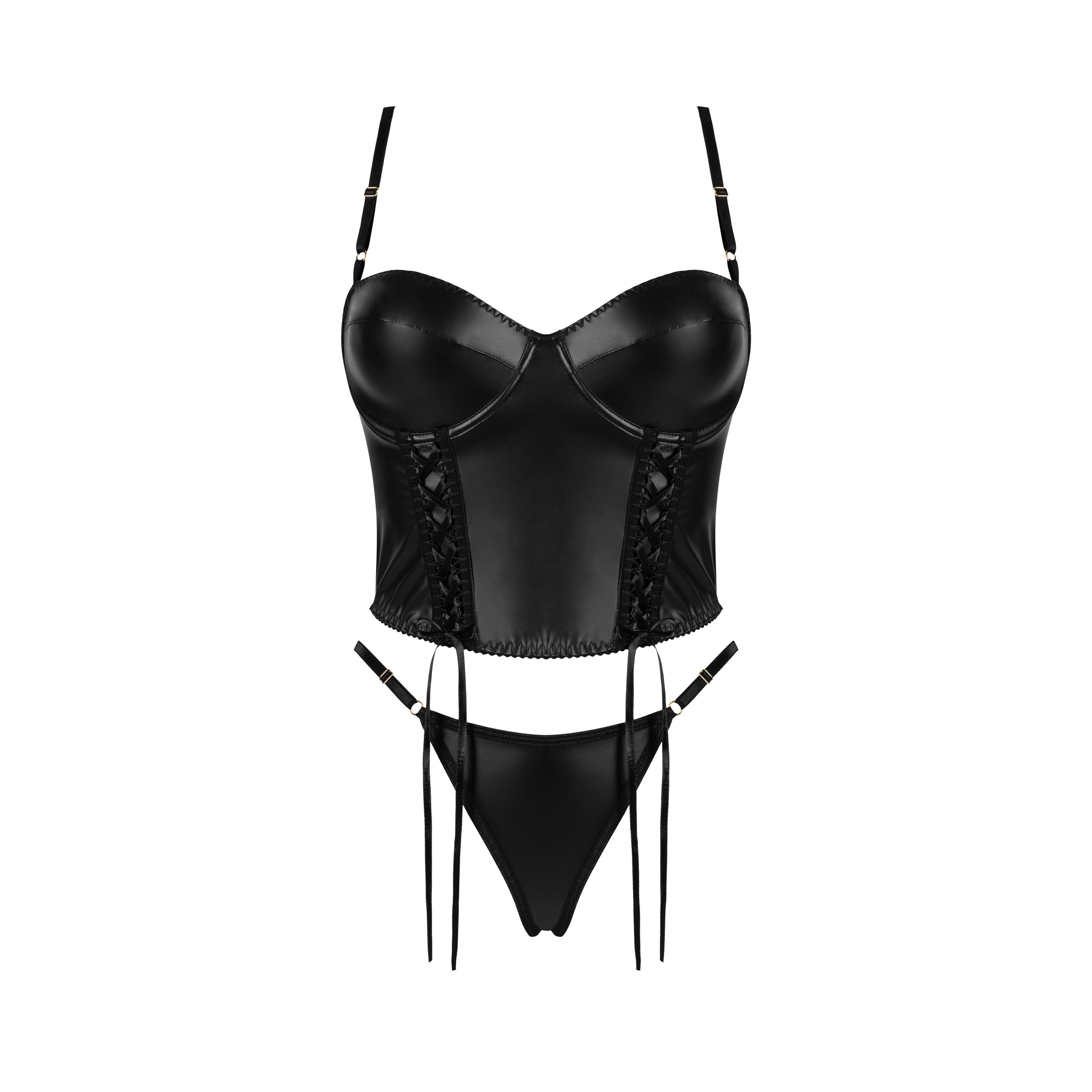 A sexy set made of eco-leather in black, perfect for women who want to emphasize their confidence and unique style. The short top - corset with underwire cups provides excellent support for the bust, and the decorative lacing at the front adds a fierce touch to the whole.