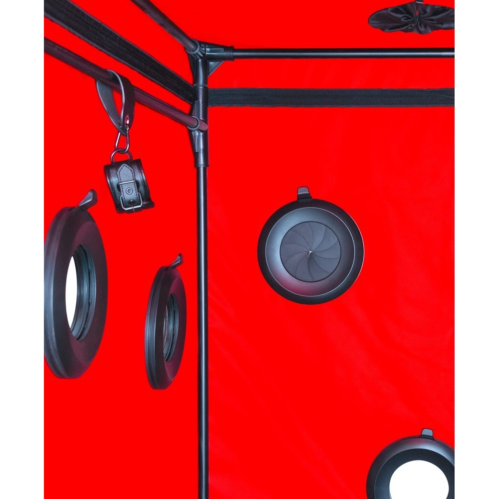 The closed BDSM box, Scandale from Secret Dome, is perfect glory hole fun, dark games, captivating role play and other fantasies. The sturdy box with its tube plug-in system and robust opaque cover can be quickly assembled and will be ready to use in no time at all. The hole for the head has a zip and a wide, adjustable collar. There are 9 holes (3 per side) that can be completely closed with flaps. It also provides convenient access via the side door with a zip. 2 fans and LED lighting ensure optimum ventilation and light in the otherwise completely dark box. There is a soft floor mat for even more comfort. The included handcuffs and ankle cuffs (1 set of each) can be positioned inside as required. The soft padded restraints can be put on and adjusted quickly with the buckle fasteners.