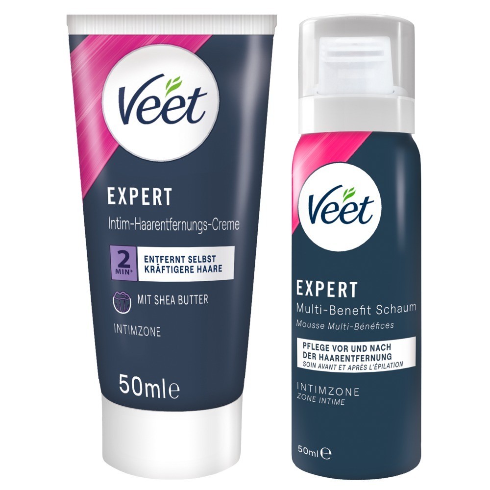 The Veet EXPERT Intimate Hair Removal Set can be used to quickly and effectively remove unwanted body hair from the entire external intimate area. The set includes the EXPERT Intimate Hair Removal Cream, specially developed for the sensitive skin of the external intimate area, which eliminates even the coarsest hairs in just 2 minutes. The formula with shea butter provides up to 48 hours of moisturisation.