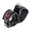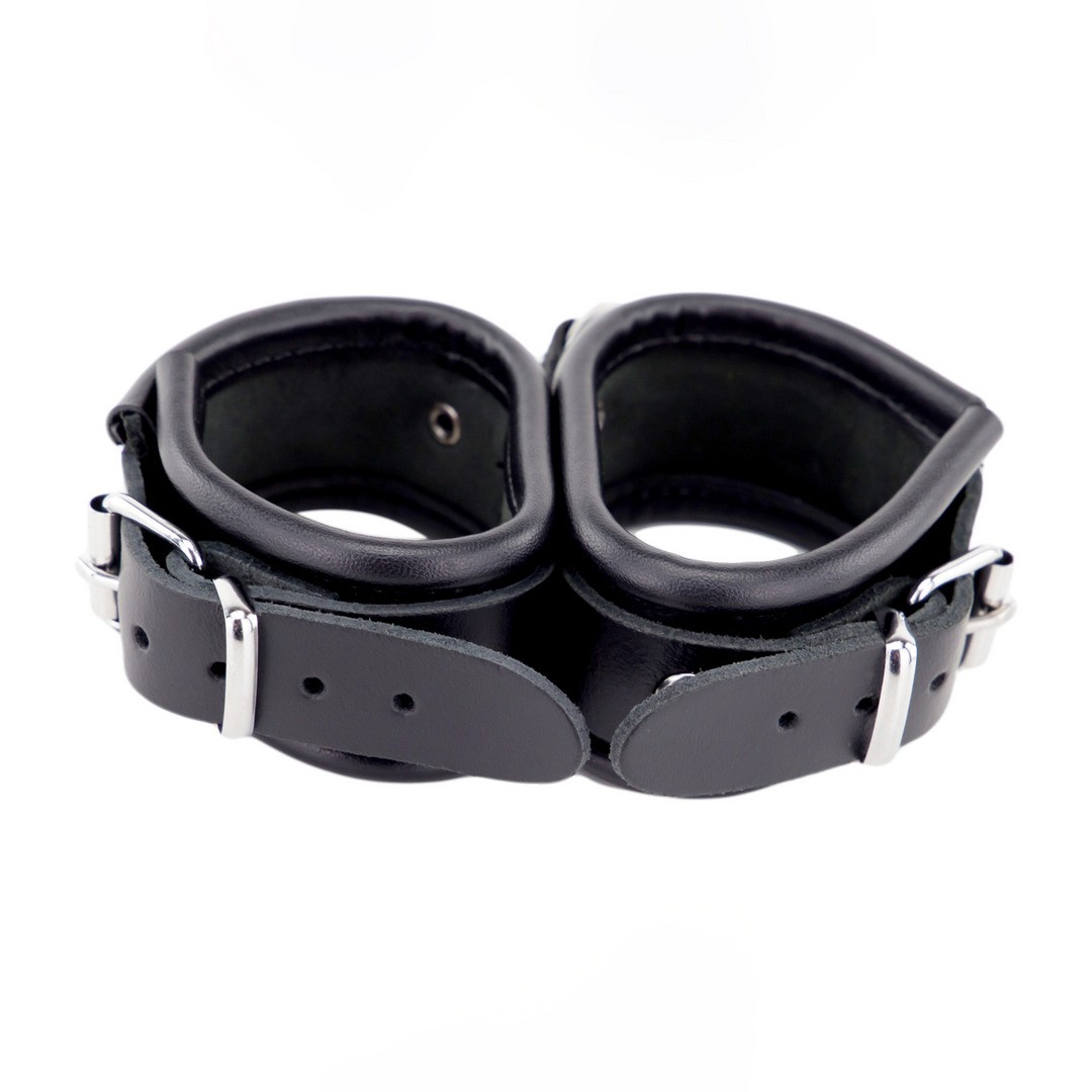 Doppelte Lederhandschellen mit Metallring und Stoffband, strapazierfähig und bequem.