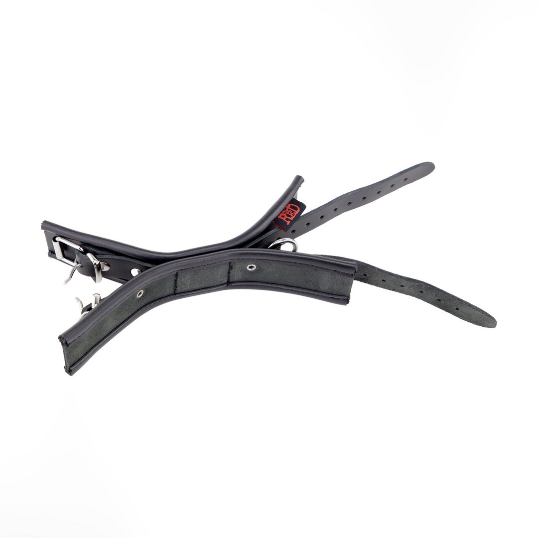 Doppelte Lederfesseln mit Stoffband und Metallring, die für festen Halt und Komfort sorgen.