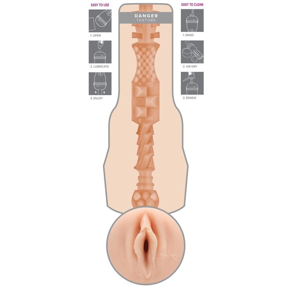 Masturbator with a vagina opening in a pearl-white case. With a realistic replica of erotic star Abella Danger's private parts. The inside of the pleasure tunnel offers an extremely stimulating combination of differently-sized dots, ribs and grooves. With a covering cap and the star's signature right next to the labia. Superskin texture.