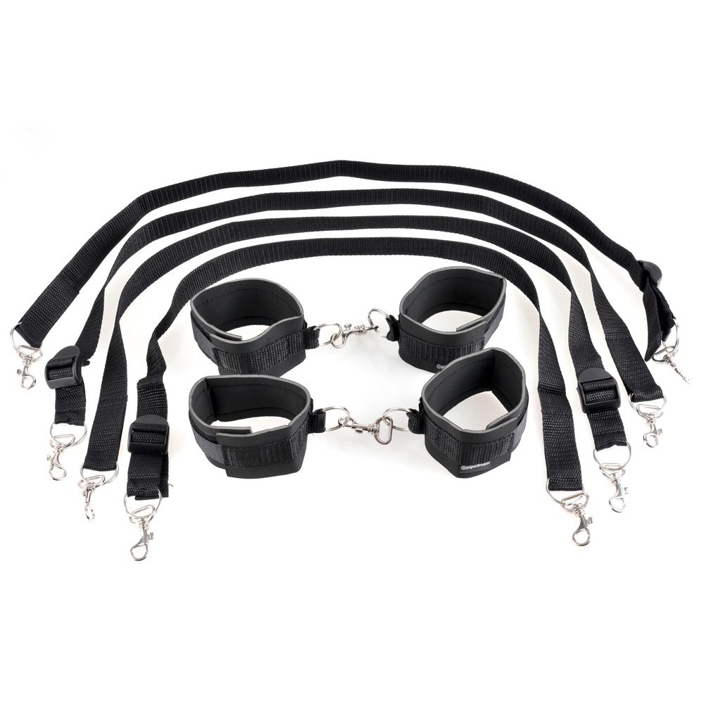 Turn your bed into the perfect stage for your bondage fantasies. Complete restraint set with secure straps, wrist and ankle cuffs, adjustable for limitless pleasure.