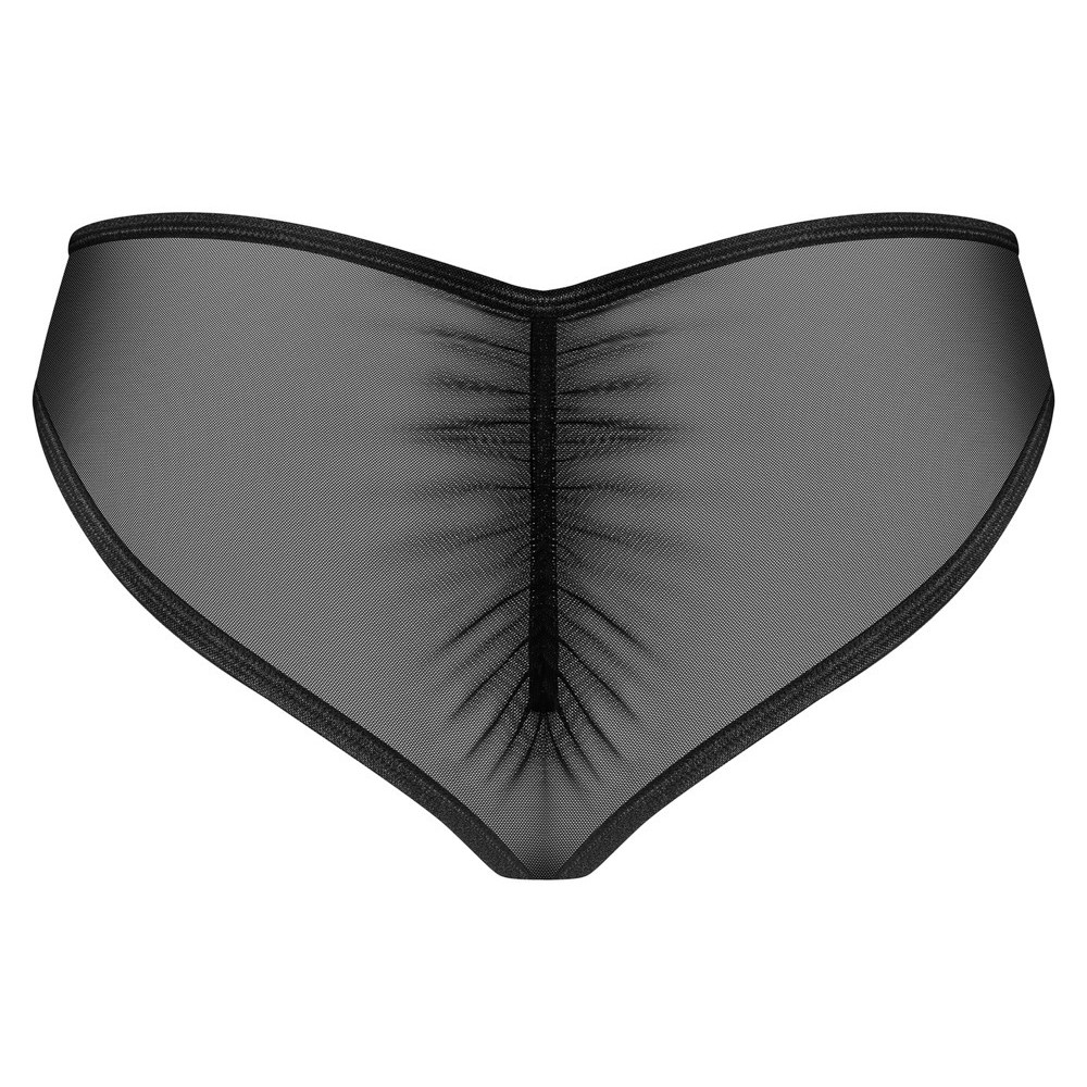 The Donarella thong by Obsessive is crafted from sheer black fabric with an intricate embroidered insert and a small decorative detail at the front. The back features delicate ruffles. The soft, stretchy fabric ensures an extremely comfortable fit all day long.
