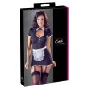 Fitted dress with adjustable and removable suspenders, round neckline, decorative collar and lace with ruffles on the sleeves and hem. Includes apron to complete the sensual look. No stockings.