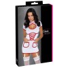 Short semi-transparent white dress in nurse style by Cottelli COSTUMES, with contrasting red details. Fitted and elasticated model with half sleeves and a daring neckline. Includes two front pockets and a mesh insert under the decorative bow. High collar with two buttons at the neck. The suspenders are adjustable and completely removable.