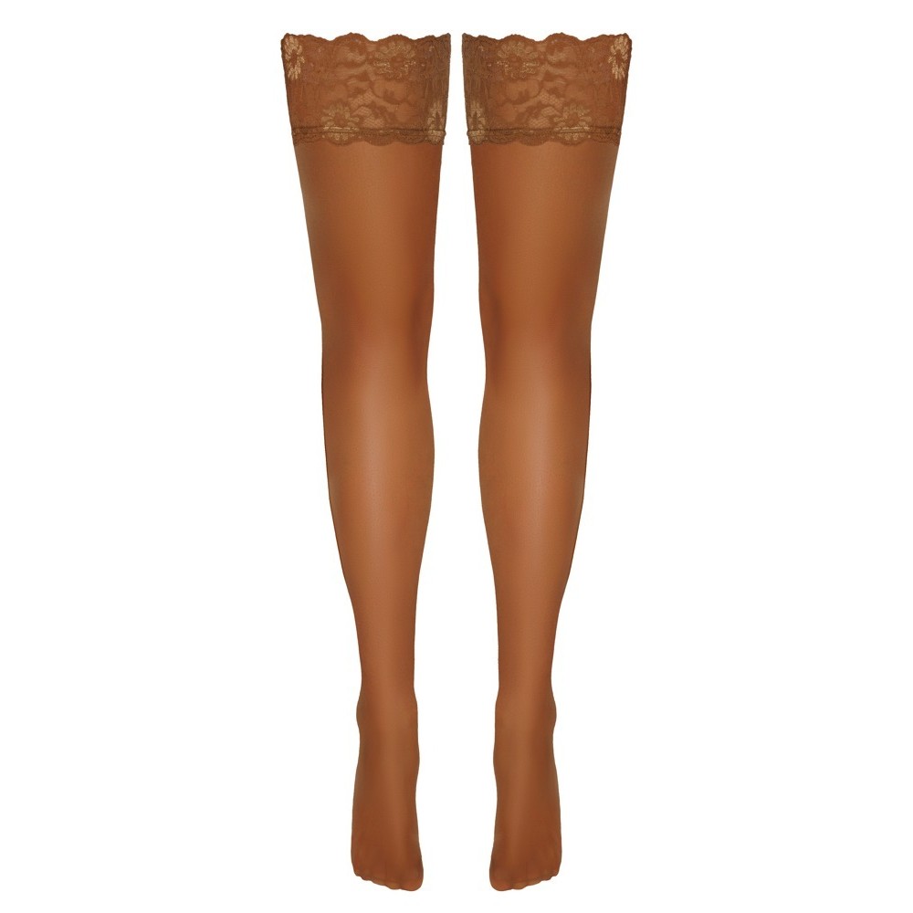 Lightweight, skin-tone hold-up stockings by Cottelli LEGWARE, with a 9 cm wide lace trim. Silicone-reinforced inner band for a non-slip fit and excellent support. 20 denier. Oeko-Tex certified. Lace designs are subject to change.