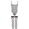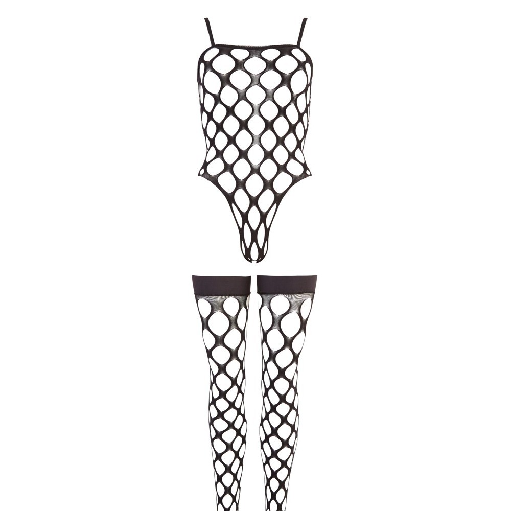 G-string body and stockings in a set. Made completely out of black, elastic, soft fence net, seamless. Stockings with a silicone lining for a non-slip fit. 90% polyamide, 10% spandex.
