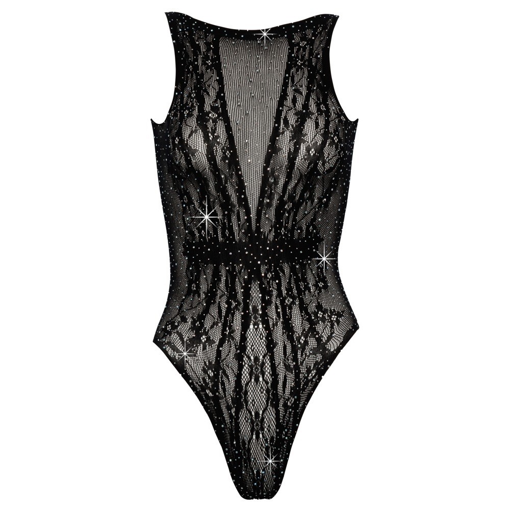 A Cottelli FANTASY bodysuit made from a fine, soft, stretchy and semi-transparent fabric, adorned with rhinestones of various sizes. The front features an interlaced pattern effect, whilst the back is highlighted by an elegant cut-out at the top. With no seams or protruding hems, it is flexible and comfortable, ensuring an excellent fit.