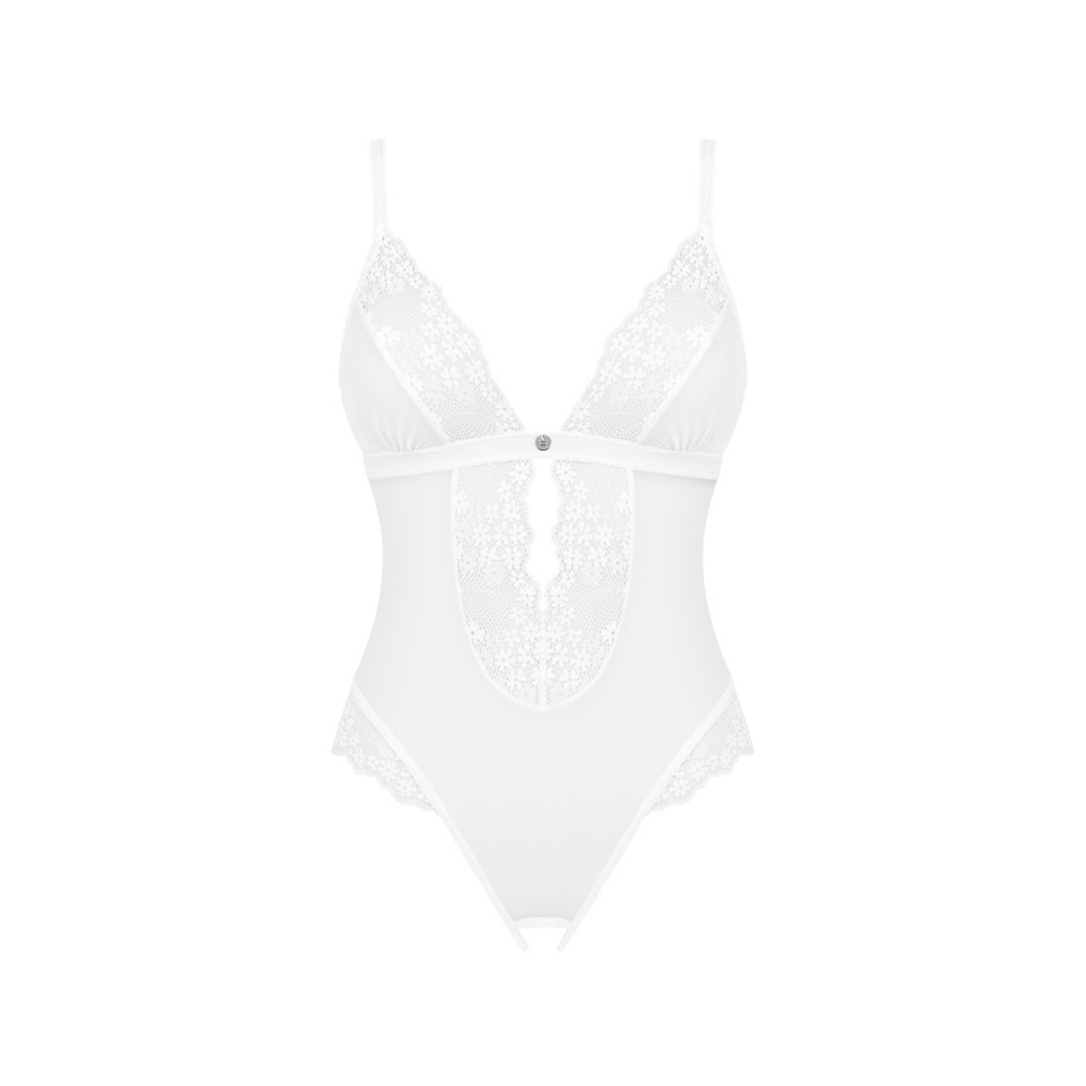 Teddy with an open crotch that promises unique moments of pleasure. Includes adjustable straps on the shoulders, back and crotch for a perfect fit, as well as a jewelled pendant between the breasts. Made from delicate, slightly stretchy fabric that provides comfort and softness to the body.