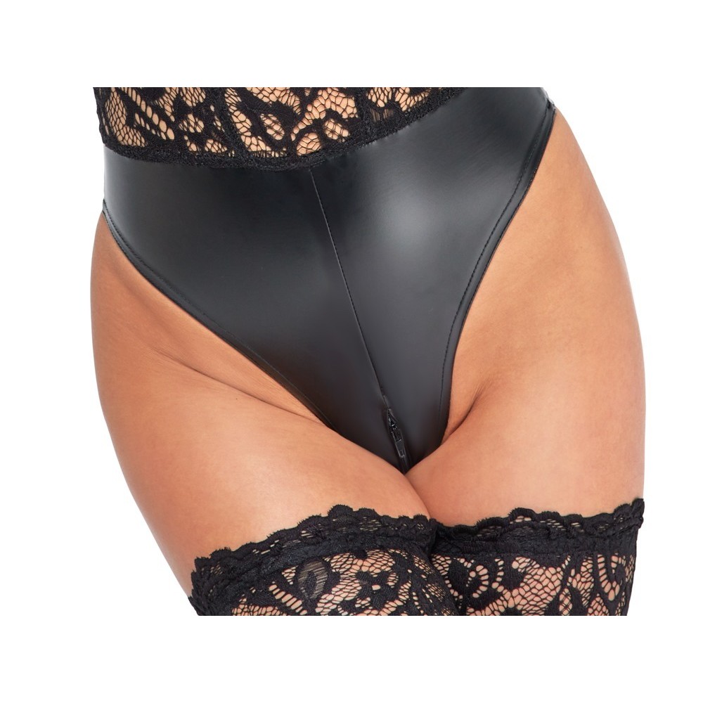 Long-sleeved teddy by Noir with a top in soft, stretchy lace and a brief section in elegant power wetlook. Deep-necked, with a practical zip fastening at the crotch for added sensuality and ease of use.