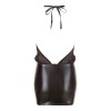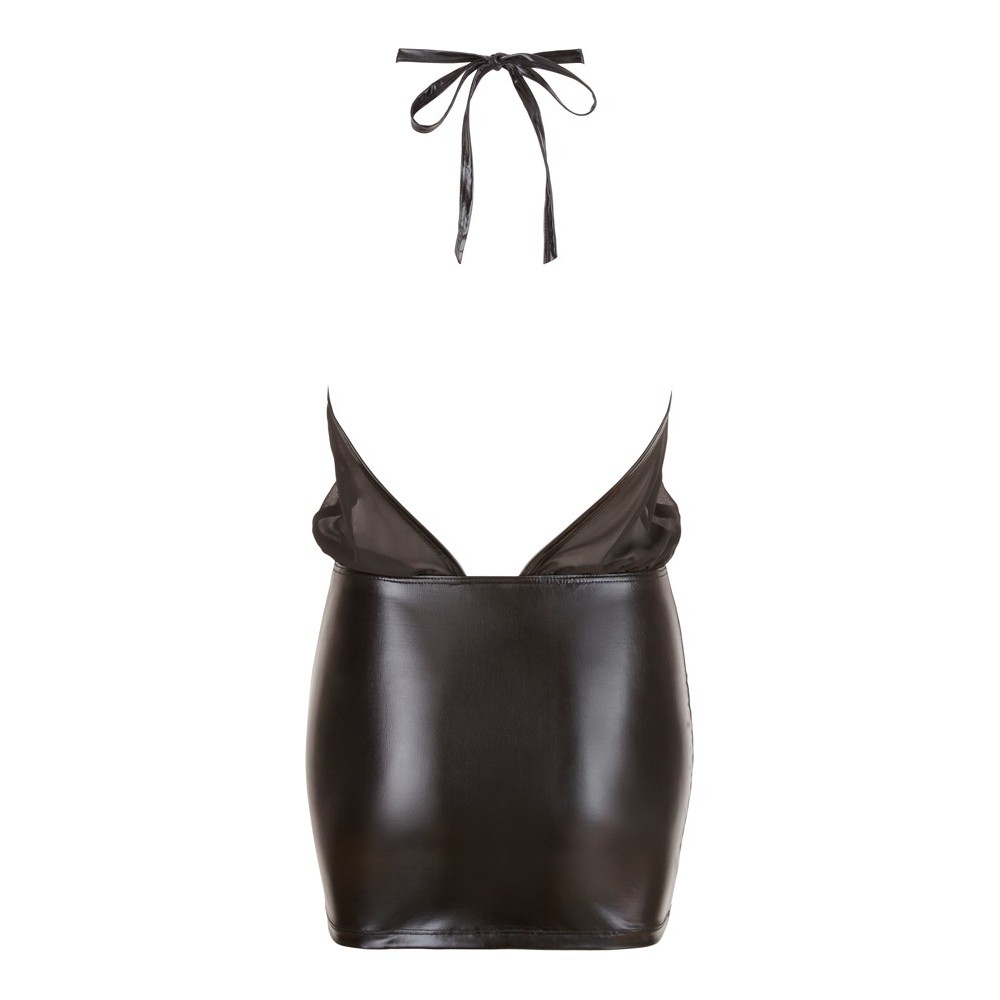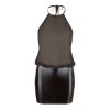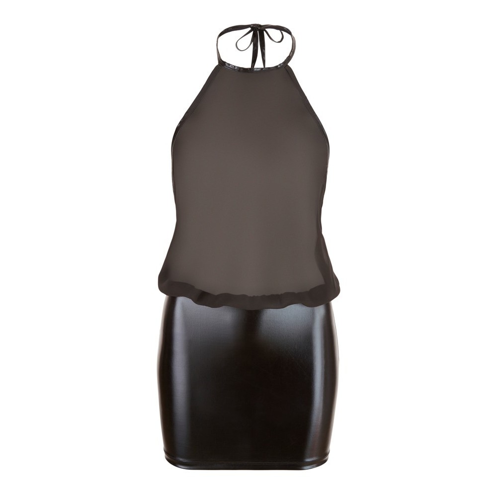 Sensual black dress with halterneck neckline that ties at the back, high collar and completely bare back. The shiny wet look skirt is tight-fitting, while the loose-fitting sheer chiffon top creates an elegant and provocative contrast.