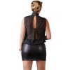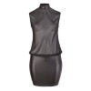 Lightweight and loose-fitting black mini dress with a sheer, sleeveless top that flatters the figure. Small cut-out at the back and high neckline with two buttons, contrasting with the opaque, fitted skirt that highlights the feminine curves.