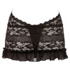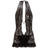 Delicate floral lace dress with a deep halterneck neckline, held together by two decorative chains. Completely open at the back, creating an extremely daring effect. Includes integrated thong. Lace pattern subject to change.