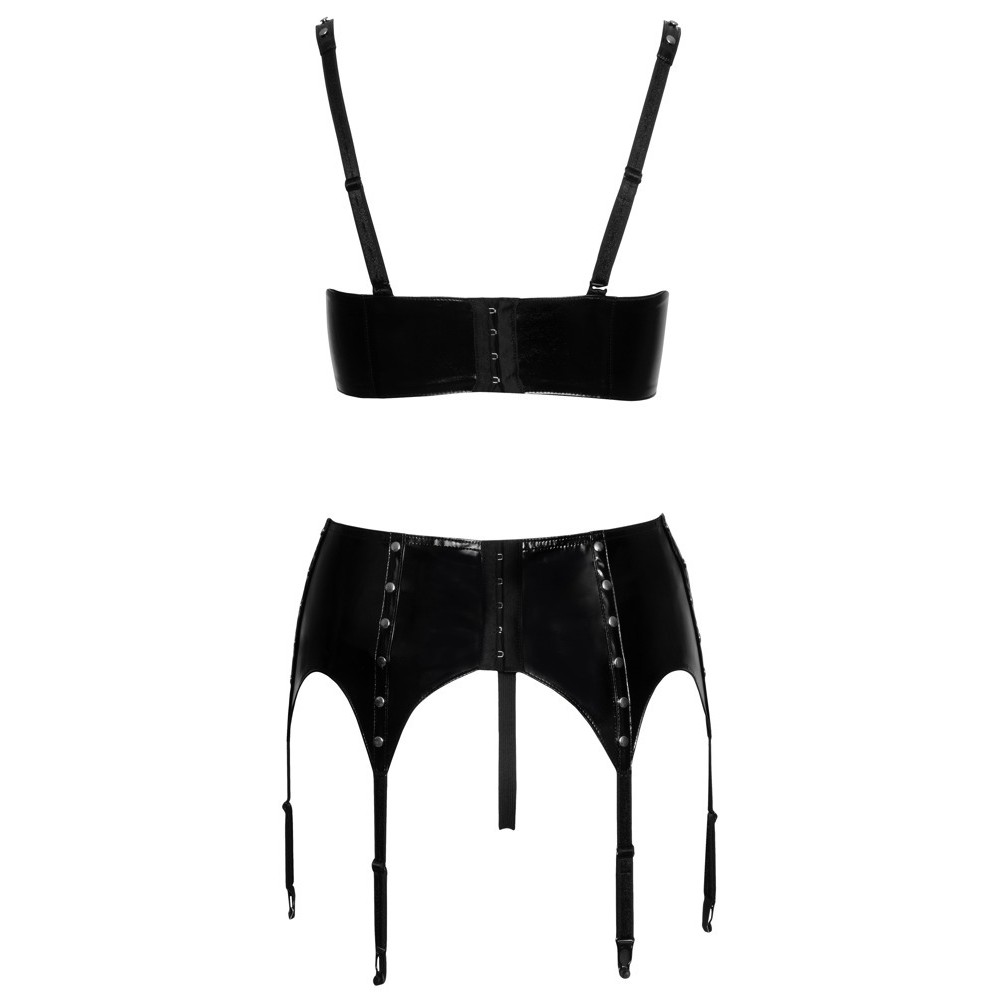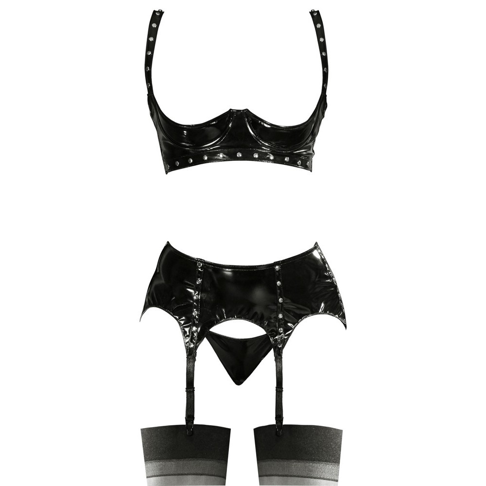 Three-piece set from Black Level, consisting of a slightly padded underwired bra, a suspender belt and a thong. All pieces are made entirely of shiny black vinyl and feature decorative studs that add a bold touch to the look. The underwired bra and suspender belt have hook fastenings at the back. The bra straps and the six straps on the suspender belt are adjustable, ensuring a perfect fit.