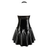 A short dress from Black Level, made entirely of shiny black vinyl, except for the cups and the middle of the neckline, which are made of powernet. The tight-fitting dress has a wide skirt that is slightly longer at the back than at the front. There is a full-length zip at the front that starts at the low-cut neckline and stops at the hem.