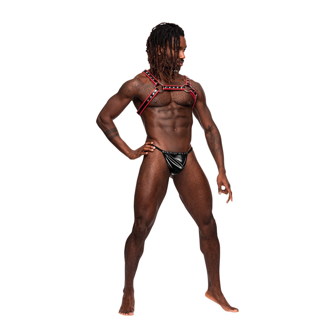 From Male Power's Leather collection, this model features a men's body harness with straps that go over the shoulders and cross at the back, offering a perfect and fully customisable fit thanks to sturdy metal fastenings. Made from high-quality materials, it combines comfort, durability and a striking design that exudes confidence and sensuality.