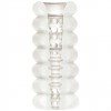 The unique triple-textured pleasure tunnel features large massage pearls at the entrance, pronounced ribs in the middle, and small stimulating pearls that taper to a tight open end.