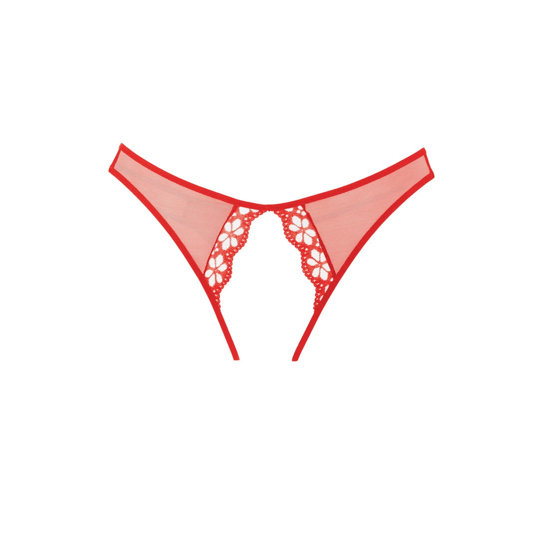 A mix of sheer mesh and flower lace with picot trim, makes this panty with peekaboo cut outs in front and back, deliciously naughty.
