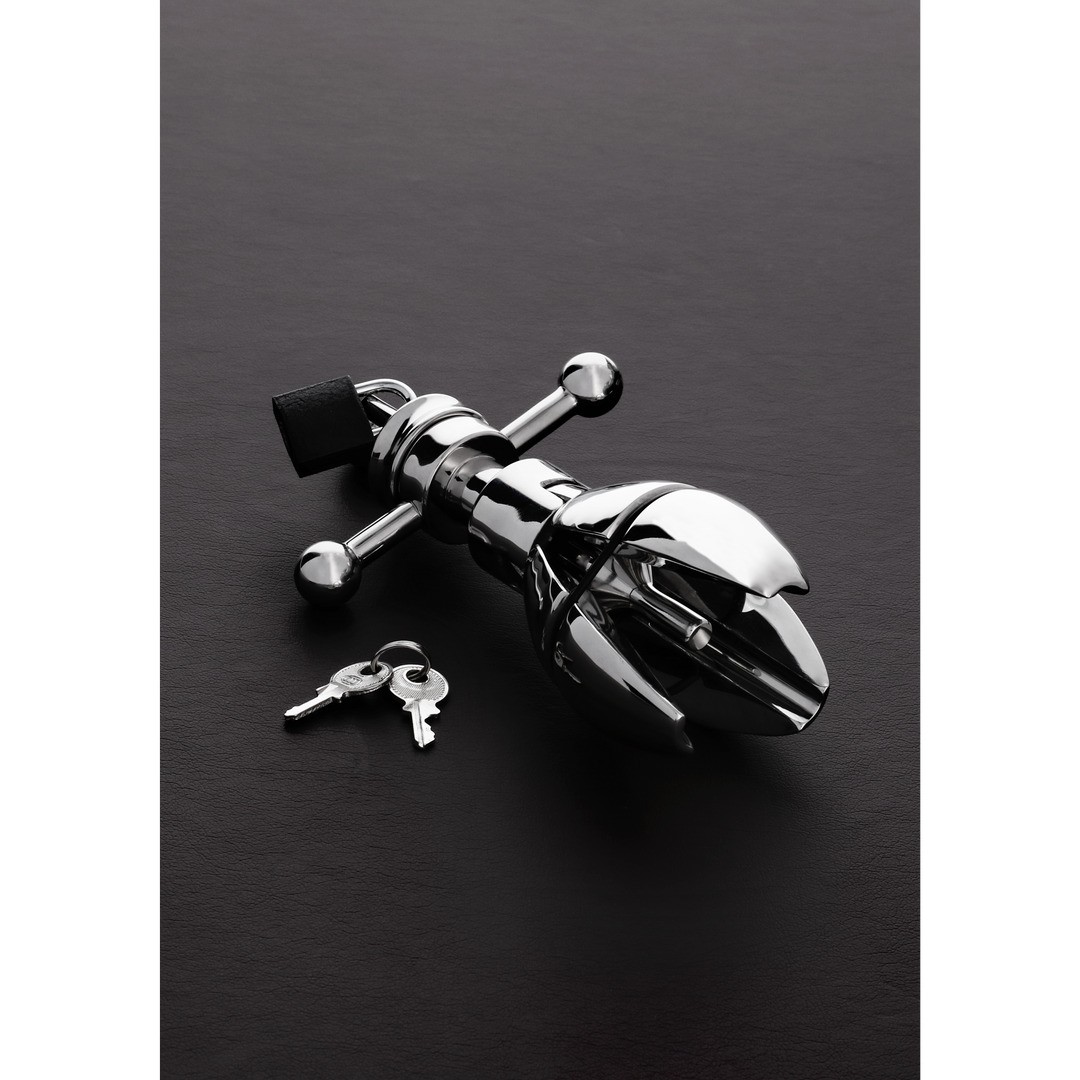 The Anal Lock Ultimate Asslock creates a new dimension in anal pleasure. Made of high-quality stainless steel, when inserted, the user feels the steel run through every inch of the cavity. When fully inserted, a simple push on the back expands the inserted part. It can be locked with a padlock for added security, functioning as an anal chastity device or anal plug. Designed for advanced players, the inner diameter is 4.3 cm when folded inwards and 5.9 cm when expanded outwards, with an insertable length of 10.9 cm. Easy to clean, it is part of the Shots Steel range.