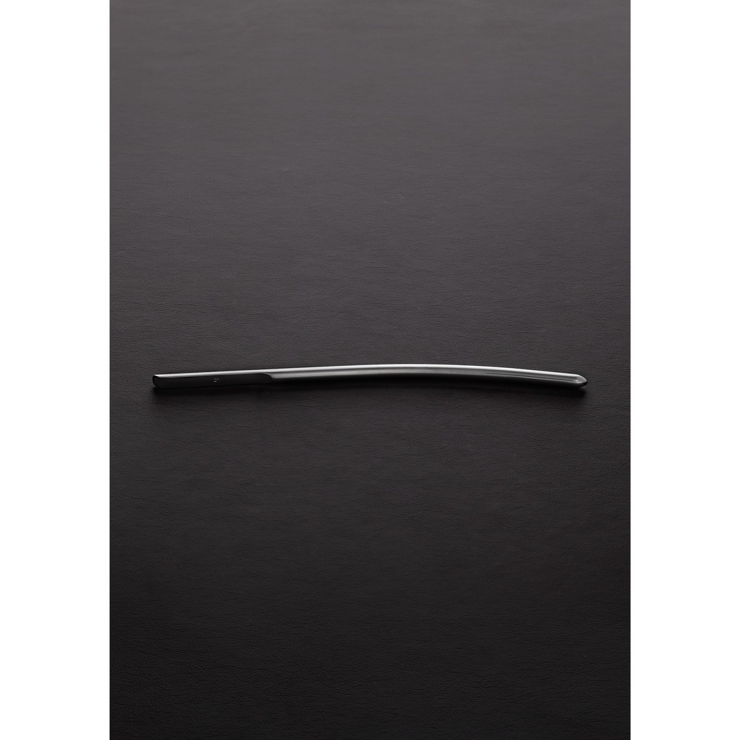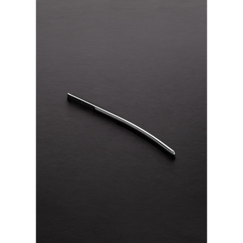 Stainless steel urethral dilator probe, polished and smooth, 18.5 cm long and 0.6 cm in diameter.