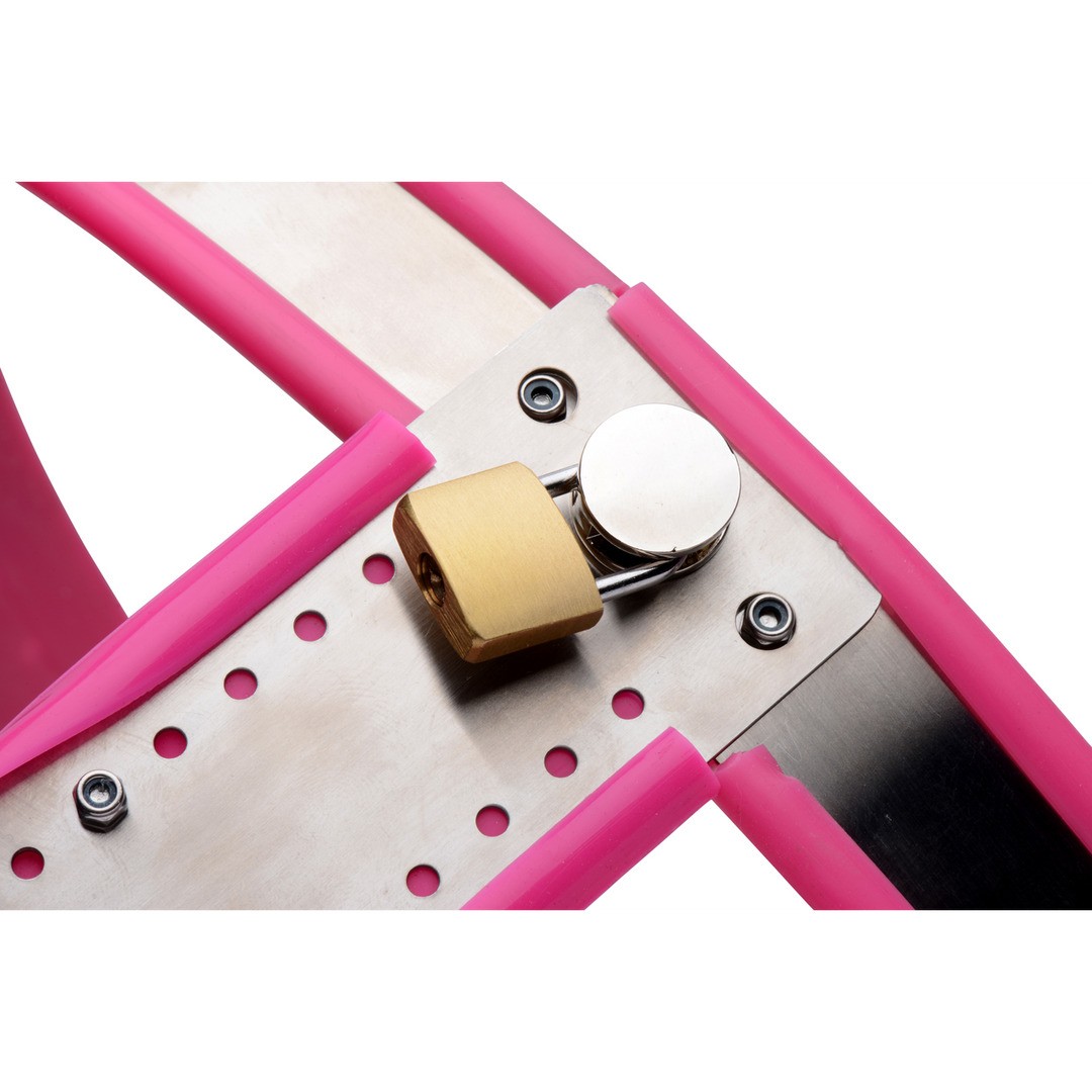 Stainless steel chastity belt with pink silicone lining, comfortable and adjustable for safe and discreet submission.