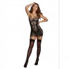 Elasticated lace garters under the thong. It features bandage-style side panels and strap details, including on the back. The straps are adjustable and there's a clasp fastening at the back. The matching thong is made of stretch mesh.