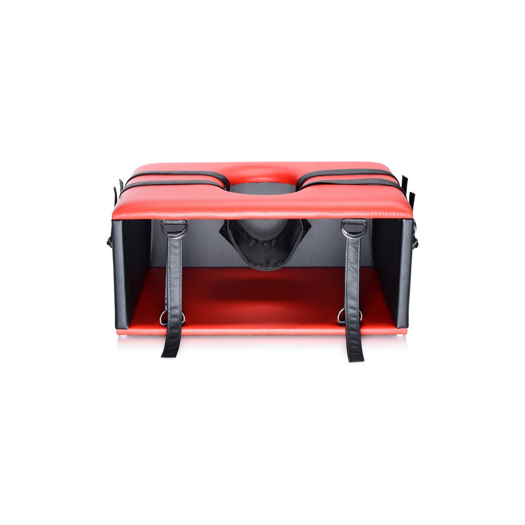The seat has a soft cushion with an opening where the head can be placed. With the included handcuffs and rings, it is possible to position your partner in the perfect posture.