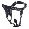 Adjustable leather chastity harness with metal ring and silicone anal plug — control and submission with style.