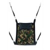 Camouflaged fabric swing with all accessories included: hooks with metal carabiners, padded footrests (11 cm wide) and cushion (23 x 38 cm). The cover is rectangular in shape.