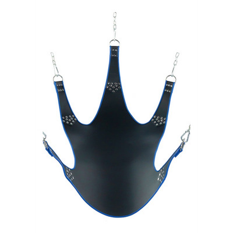 Black leather swing with 5 points features a spacious and comfortable rectangular shape. The blue finishes give it a bold and sophisticated style.