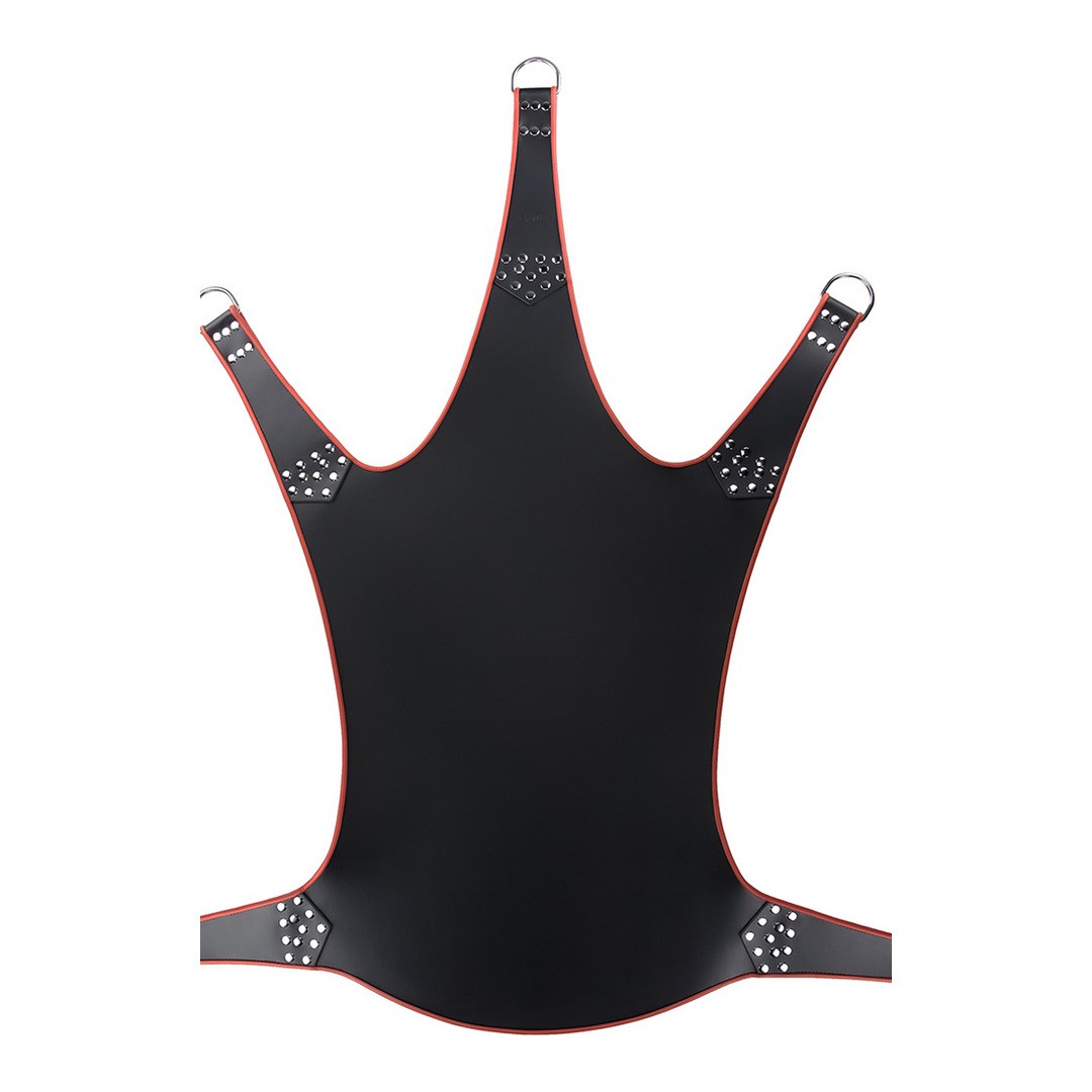 Black leather swing with 5 attachment points and red trim for a bold and comfortable style.