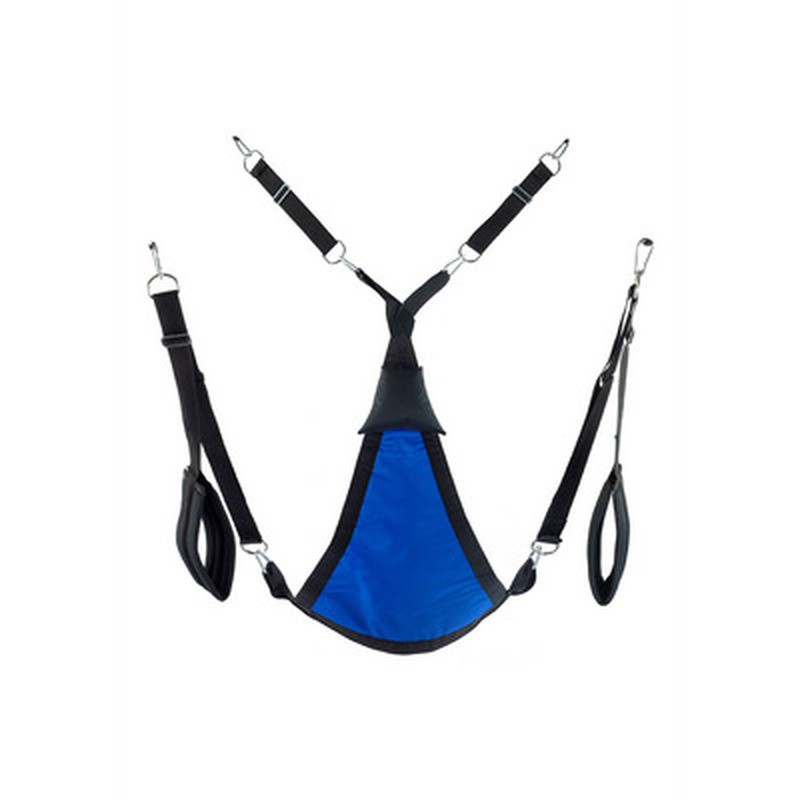 This blue fabric swing is designed with a triangular shape and camouflage fabric. It can be adjusted with 3 or 4 attachment points. It includes the following accessories: 4 hooks with metal carabiners, padded footrests (11 cm wide) and a black triangular cushion (24 x 20 cm).