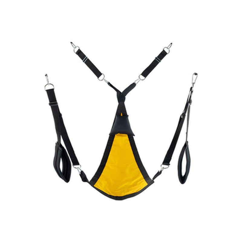 This yellow fabric swing is designed with a triangular shape and camouflage fabric. It can be adjusted with 3 or 4 attachment points. It includes the following accessories: 4 hooks with metal carabiners, padded footrests (11 cm wide) and a black triangular cushion (24 x 20 cm).