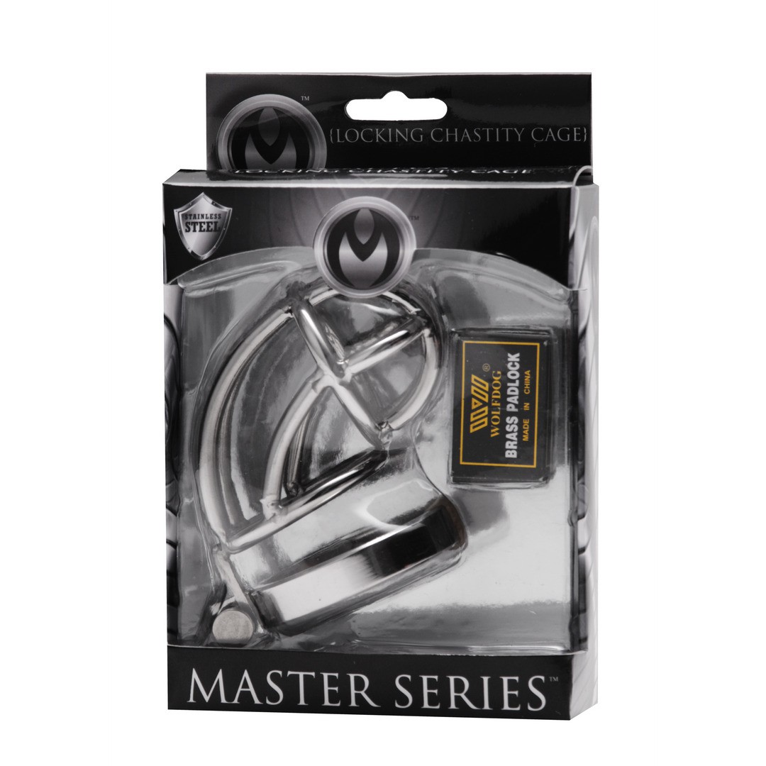 This erection inhibitor cage is made of durable stainless steel and features a shortened cage with a base piece for locking. Simply place the penis in the cage and secure the base ring using the simple pin mechanism.