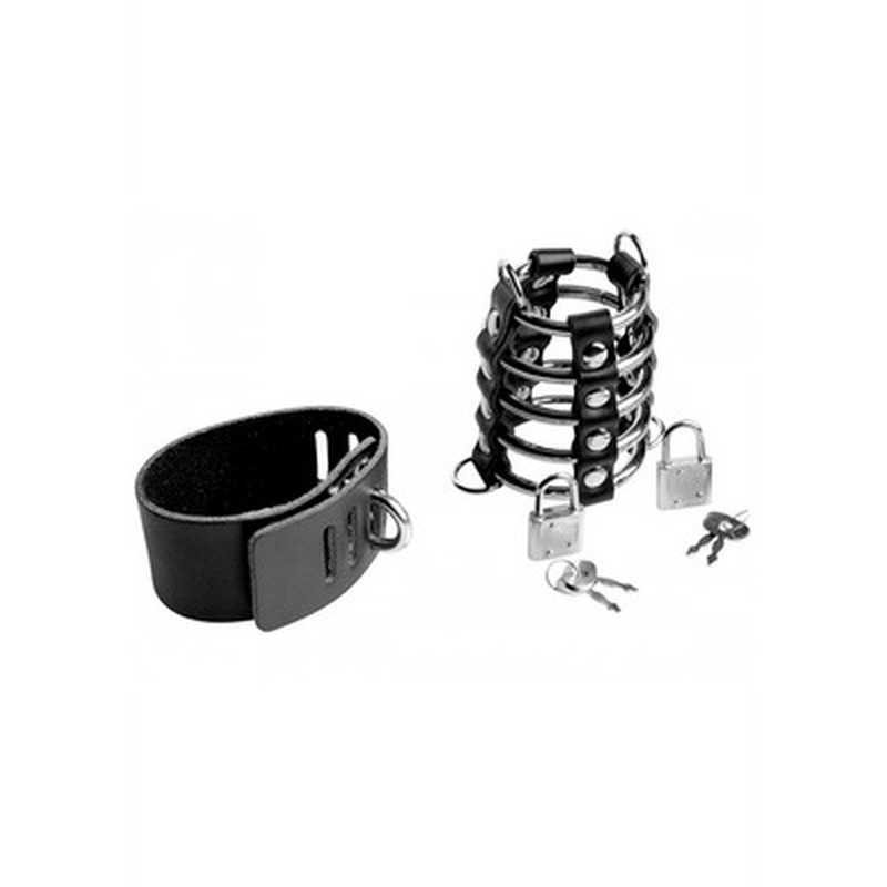 Two adjustable leather straps hold the cage firmly in place, ensuring total containment and making any attempt to escape impossible. One of the straps wraps around the penis and testicles, while the other acts as a ball-stretcher, clamping tightly around the base of the scrotum.