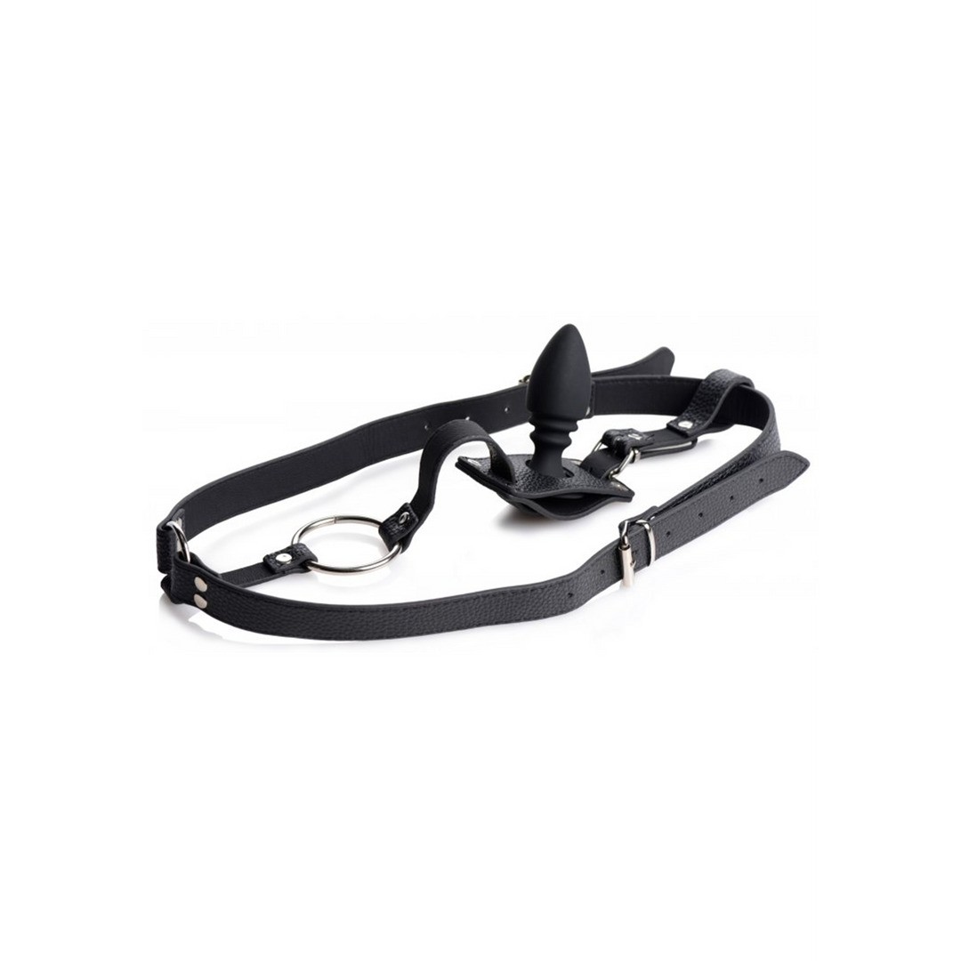 Keep your partner deliciously filled and ready for action with this dual-function harness! This piece combines a firm, uncompromising metal cock ring with a textured silicone butt plug. The ring fits under the penis and scrotum, promoting a firmer erection and intensifying sensitivity.