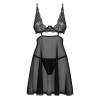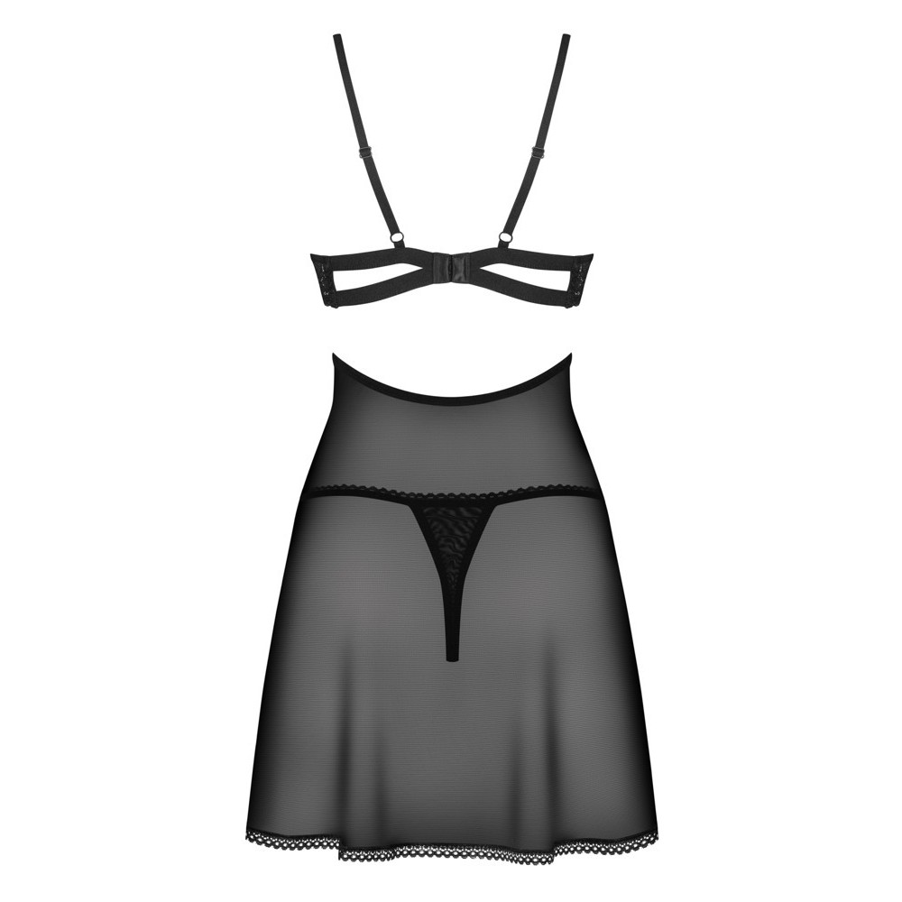 The black lingerie set, Nutris from Obsessive, contains a babydoll and string. The babydoll is made out of exciting transparent material and has underwired lace cups. The decorative element between the cups is a real eye-catcher. There is also a fancy cut-out - the flared skirt part starts underneath the cut-out. The skirt part is made out of soft, stretchy tulle. The hook fastener at the back and the straps can be adjusted.