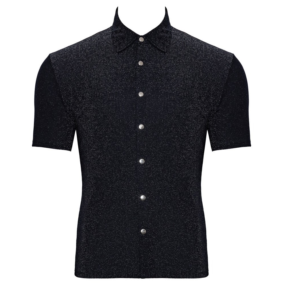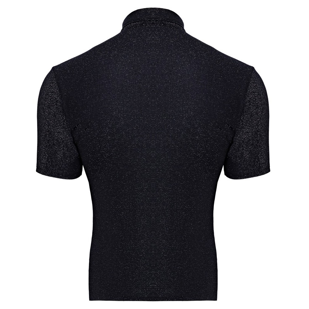 The Svenjoyment shirt, tight-fitting and flattering, has a shiny, slightly transparent silver Lurex look. It has short sleeves, a high collar and a row of press studs down the front. It is soft and stretchy for a very comfortable fit.