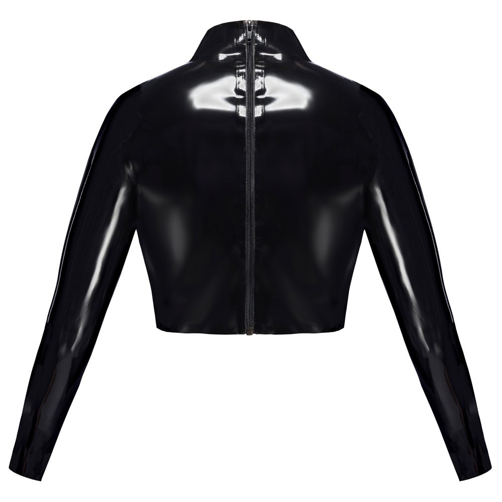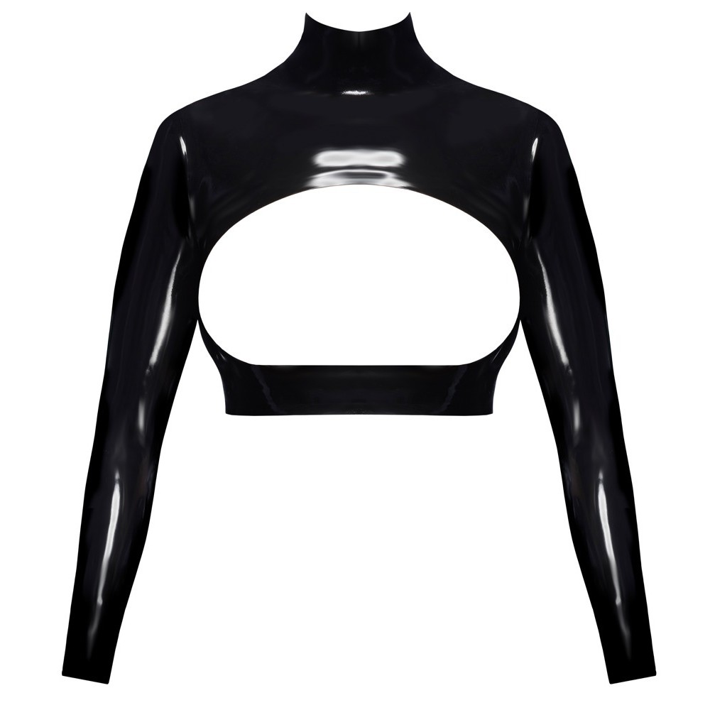 The crop top from LateX is made out of natural black latex (thickness 0.35 mm) and it also has a large cut-out at the front for showing off the breasts in a breathtaking way. The top is stylishly elegant and has a stand-up collar and long sleeves. There is a full-length zip at the back, which makes it easy to put on and take off.