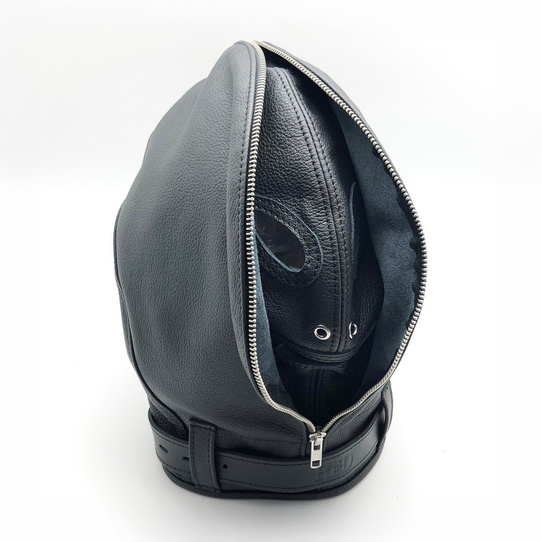 Premium black leather Balaclava sensory deprivation hood, manufactured in Europe, for intense, elegant and immersive experiences.